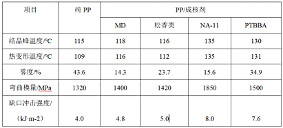 The following table lists the effects of four types of organic nucleating agents on PP properties, with a nucleating agent addition mass fraction of 0.2%.